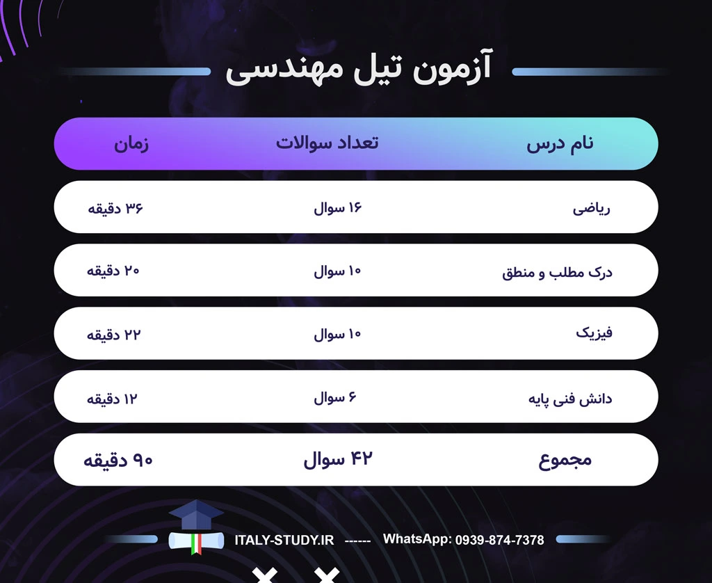 آزمون ENGLISH TIL I برای پذیرش در رشتههای انگلیسی زبان کارشناسی مهندسی کامپیوتر، مهندسی الکترونیک، مهندسی مکانیک، مهندسی خودرو، مهندسی عمران و محیط زیست هست که هر سال بصورت حضوری در ایتالیا، ترکیه و ازبکستان برگزار میشود. برای پذیرش در آزمون، متقاضیان ۹۰ دقیقه فرصت دارند تا به ۴۲ سؤال پاسخ دهند. سوالات در ۴ بخش در ۴ درس مختلف تقسیم شدهاند. تعداد سوالات به شرح زیر تقسیم شده است: